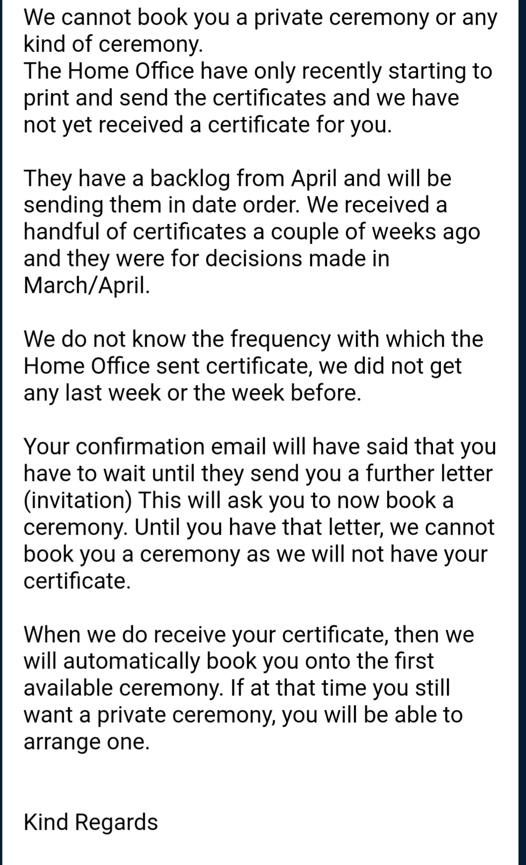 Re: Citizenship Ceremony cancelled due to Covid-19