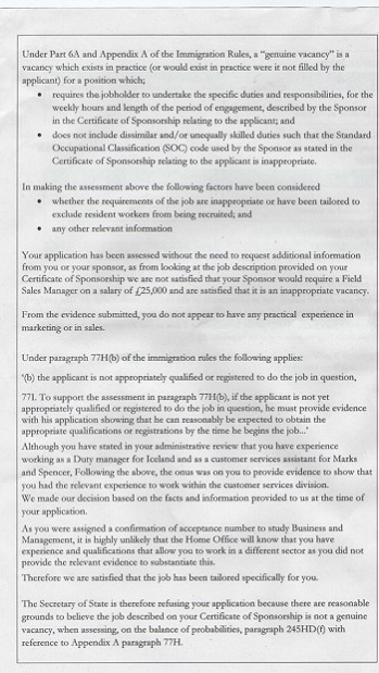 Good evening. I have received decision from my admin review and unfortunately I have been refused again. Well they have partly accepted our arguments. They have backed down on the exemption point and now clearly accept that the post did not need to be advertised. They have, however, maintained the genuineness argument. They have given the further argument that they were not aware of my work experience when they made the decision.